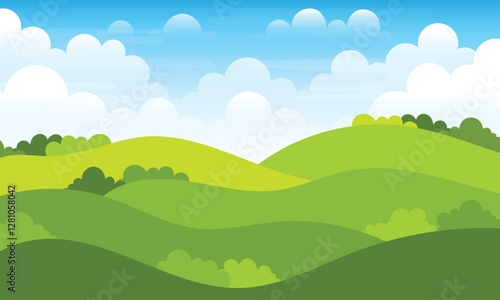 Fototapeta premium cartoon landscape of green hills and white clouds on a blue sky background.for nature concept poster banner design.vector illustration