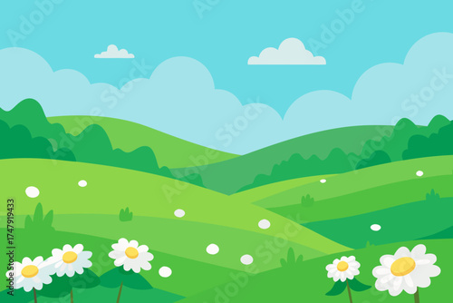 Obraz premium Cartoon landscape with daisies and rolling green hills