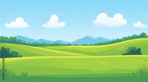 Obraz premium Cartoon Landscape with Green Hills, Blue Mountains, and White Clouds