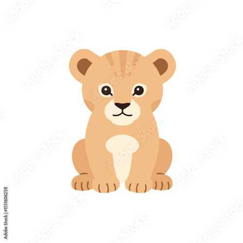 © Cocok, Obraz premium Cartoon Lion Cub Sitting with Simplified Facial Features and Light Brown Fur.