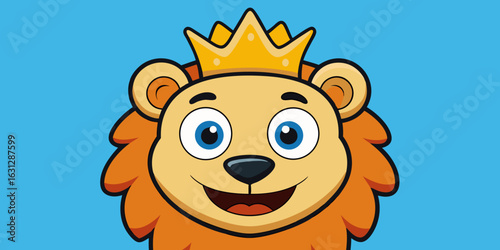 © MYT Studio, Obraz premium Cartoon lion king drawing vector illustration for kids and children with blue background and golden crown on transparent background