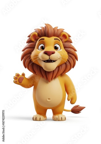 © Por, Obraz premium Cartoon lion with golden-brown mane & fur, waving cheerfully against a plain white background