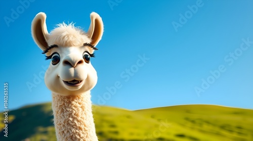 © Vera Kokorina, Fototapeta premium Cartoon llama with a cheerful expression in a sunny landscape