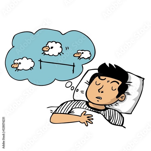 Fototapeta premium cartoon man counting sheep because he can't sleep