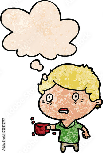 © lineartestpilot, Obraz premium cartoon man with cup of coffee and thought bubble in grunge texture pattern style