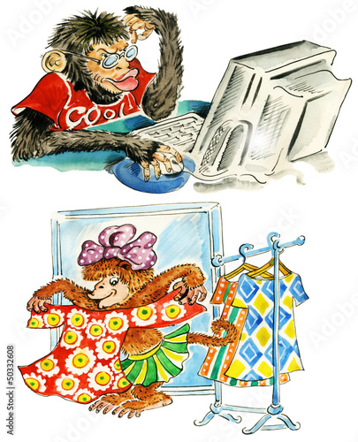© shibanuk, Obraz premium Cartoon monkeys: guy by computer, girl in front of mirror