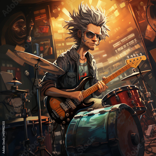 Fototapeta premium Cartoon musician with bass guitar and drums