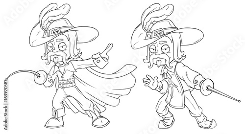 © GB_Art, Fototapeta premium Cartoon musketeer in hat with sword character vector set