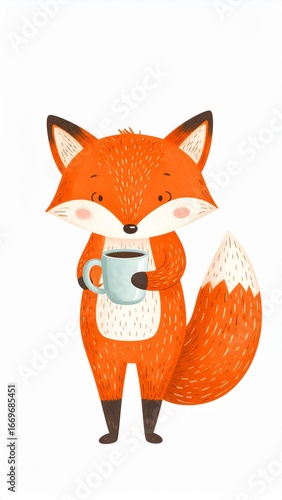 © Sleeping Carbuncle, Obraz premium Cartoon Orange Fox Standing and Holding a Blue Cup Isolated on White Background