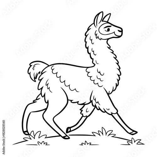 Naklejka premium Cartoon outline of a walking alpaca, black and white line art illustration...