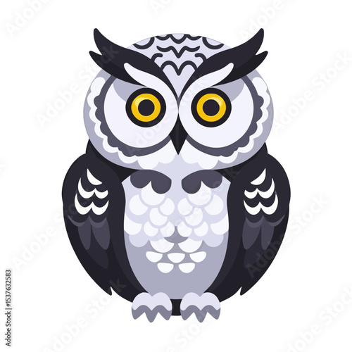 Naklejka premium Cartoon Owl Illustration-Cute Bird with Big Yellow Eyes-Adorable Wildlife Art...