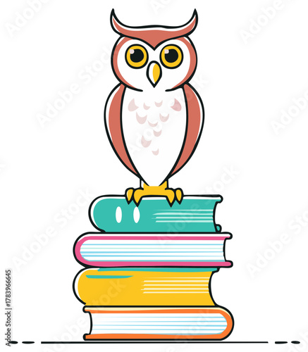 Obraz premium Cartoon owl perched atop a stack of colorful books, educational illustration