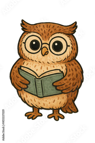 © Margarita Ratatosk, Fototapeta premium Cartoon owl reading book on transparent background. Cute forest animal character for education, literacy, and learning concept. Illustration for children's book or school design