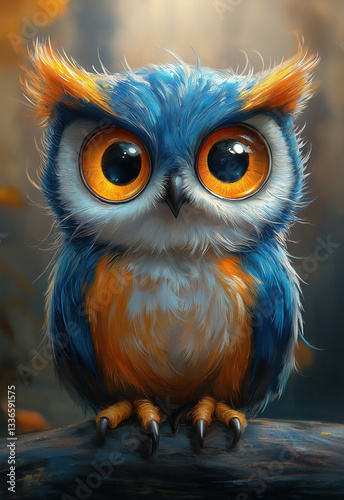 © Andreas, Fototapeta premium Cartoon owl with big eyes on blurred background.