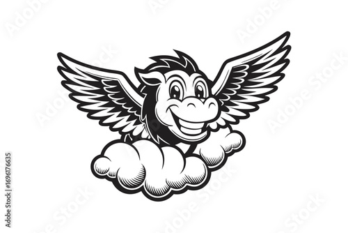 Obraz premium Cartoon Pegasus Mascot on Cloud, Wings Spread, Happy Expression,