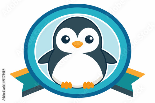 © Nurul, Fototapeta premium Cartoon Penguin in a Blue Circle with a Ribbon