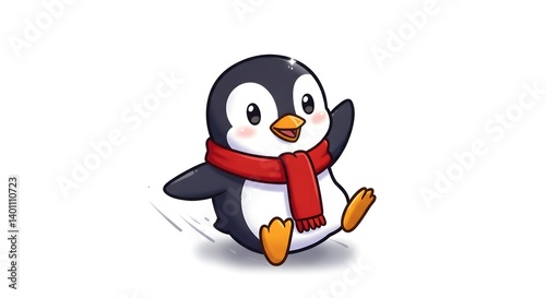 Naklejka premium Cartoon Penguin in Red Scarf Sliding on Belly