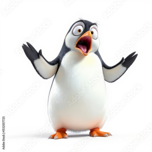 © Manji, Fototapeta premium Cartoon Penguin Shouting with Arms Up on White Background