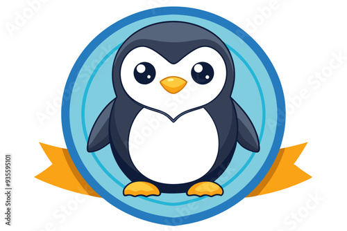 Fototapeta premium Cartoon Penguin with Big Eyes in a Blue Circle Frame