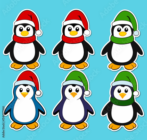 Fototapeta premium Cartoon Penguins Wearing Hats and Scarves on a Light Blue Background