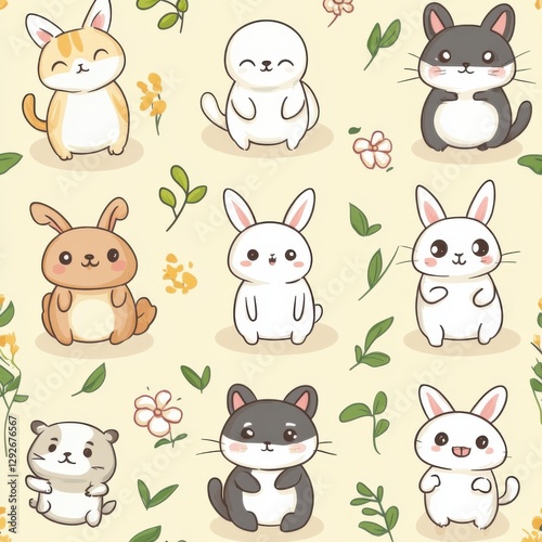 Fototapeta premium Cartoon Rabbits, Hamsters, and Floral Sprigs Pattern