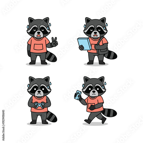 Obraz premium Cartoon raccoons in trendy outfits using gadgets with various gestures