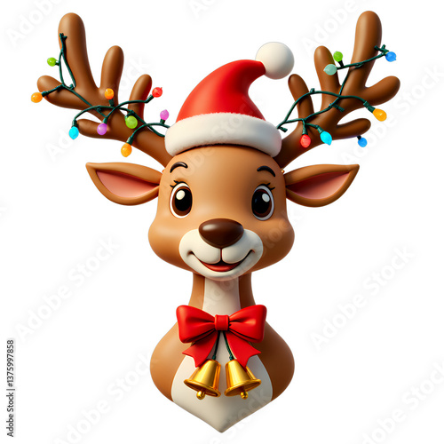 © LTh, Naklejka premium Cartoon Reindeer with Lights & Santa Hat. Transparent background. Festive.