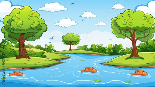 © Iswanto, Naklejka premium Cartoon River with Fish.