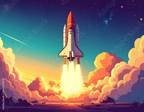 Fototapeta premium Cartoon rocket launching skyward through clouds, into cosmos