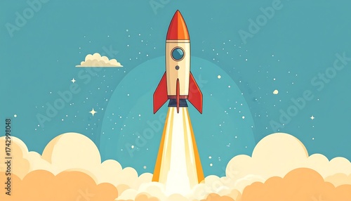 © zerogami, Fototapeta premium Cartoon rocket ship launching from clouds into a starry sky with illustration.