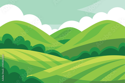 © Jannatul, Obraz premium Cartoon rolling hills with fields offer an idyllic landscape beneath the sky and clouds