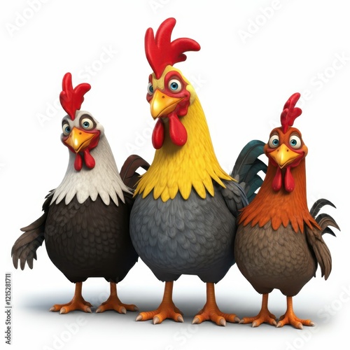 © KenPix, Fototapeta premium Cartoon rooster, stylized farm animal, plump body, colorful feathers, red comb and wattles, expressive eyes, white neck feathers, brown and black plumage, orange feet, 3D rendering, digital art, vibra