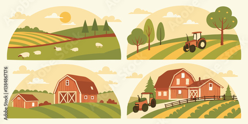 Naklejka premium Cartoon Rural Farm Scenes Vector Illustration Sheep Tractor Barn Farmhouse...