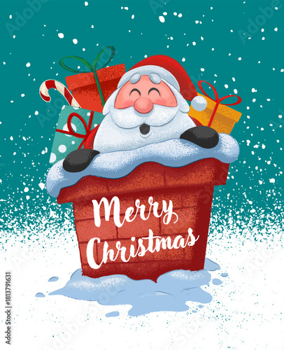 Fototapeta premium Cartoon Santa Claus comes out of the chimney with gifts
