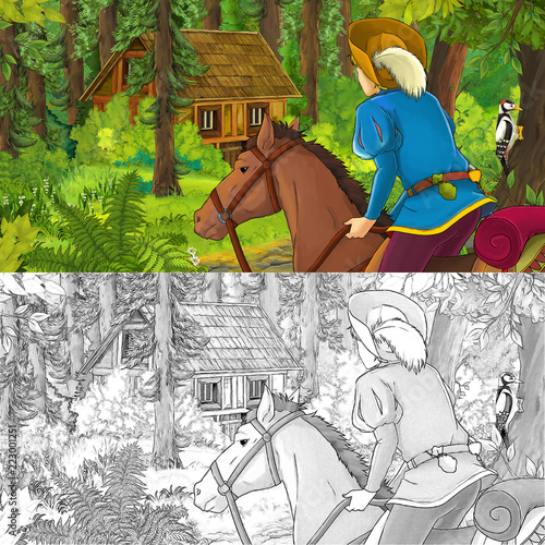 Obraz premium cartoon scene with woman princess in the forest near hidden wooden house - with artistic coloring page - illustration for children