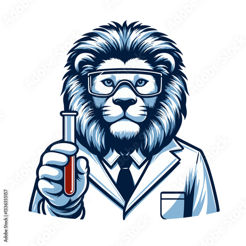 Fototapeta premium Cartoon scientist lion in white lab coat holding test tube. Perfect for research facilities, laboratory services, chemical analysis companies, or scientific education programs.