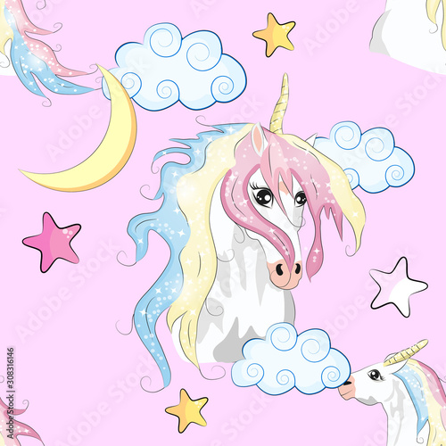 Fototapeta premium Cartoon seamless pattern. Unicorn with rainbow and clouds, designed print.