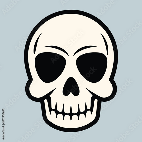 Fototapeta premium Cartoon skull with black eyes and teeth on blue background