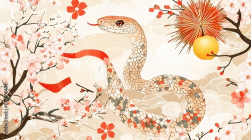 © 69 Timeless Studio , Fototapeta premium Cartoon snake holding a golden peach, with a background featuring plum blossoms, fireworks, and red banners.