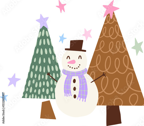 Naklejka premium Cartoon snowman with hat and scarf is standing among patterned trees, stars, transparent background