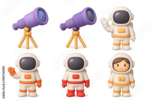 Fototapeta premium Cartoon space icons featuring cute astronauts and telescopes for digital design projects