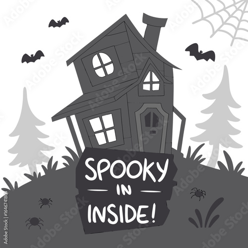 © Hamzaadobe06, Fototapeta premium Cartoon spooky house with bats and spiderweb on a hill with a sign that says spooky inside