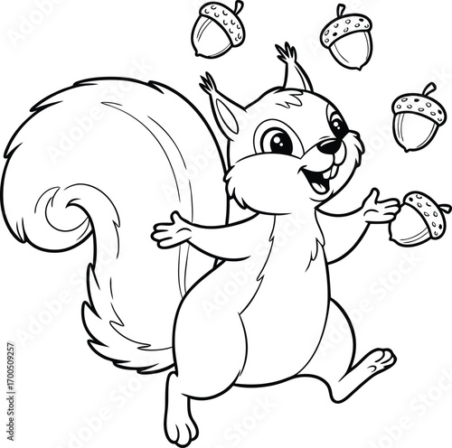 Obraz premium Cartoon squirrel character joyfully jumping with acorns black and white...