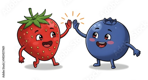 Fototapeta premium Cartoon Strawberry and Blueberry High-Fiving with Smiles