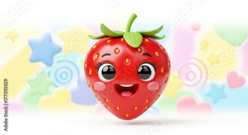 Obraz premium Cartoon strawberry with a smiling face and background of stars and hearts