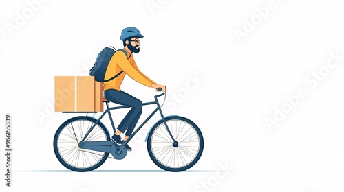 © anantachat, Fototapeta premium Cartoon-style bicycle courier with a delivery box on the back riding through a clean white background Large space for text in center Stock Photo with copy space