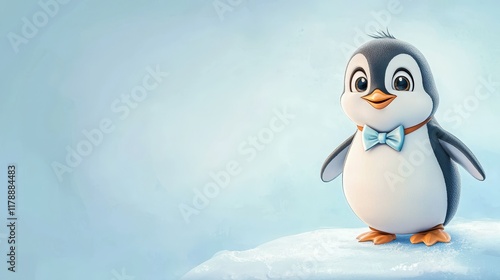 © Ameen, Fototapeta premium Cartoon-style chubby penguin wearing a bowtie, standing on ice, isolated on a soft blue background.