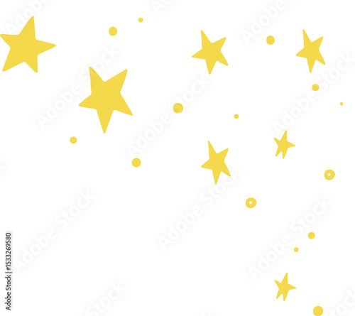 © vectorfusionart, Naklejka premium Cartoon-style flat design yellow stars and dots are scattering diagonally on transparent background