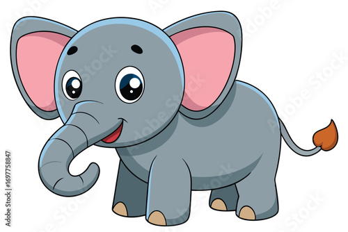© Dipta, Naklejka premium Cartoon Style Gray Elephant with Big Eyes and Tail on White Background