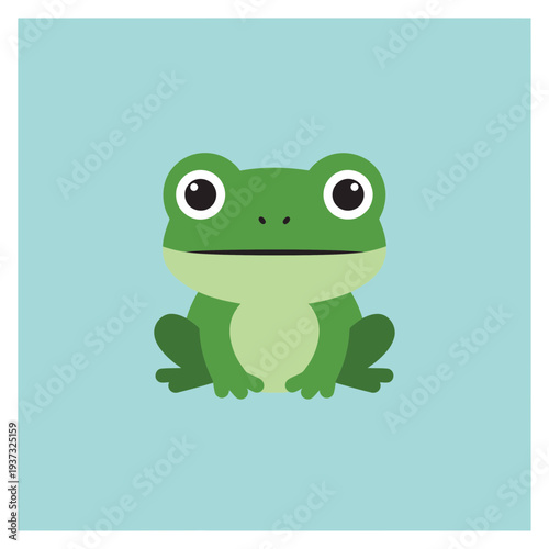 © damar, Obraz premium Cartoon-style green frog with large eyes sitting on a light blue background.